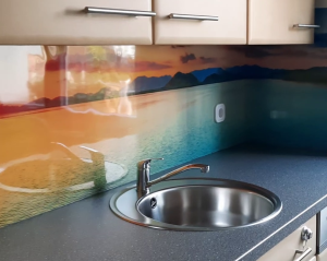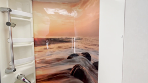 Duschrückwand “STRAND AM ABEND“ im Wohnmobil Wer viel unterwegs ist, will Komfort, Funktionalität und eine schöne Optik im Wohnmobil. Die