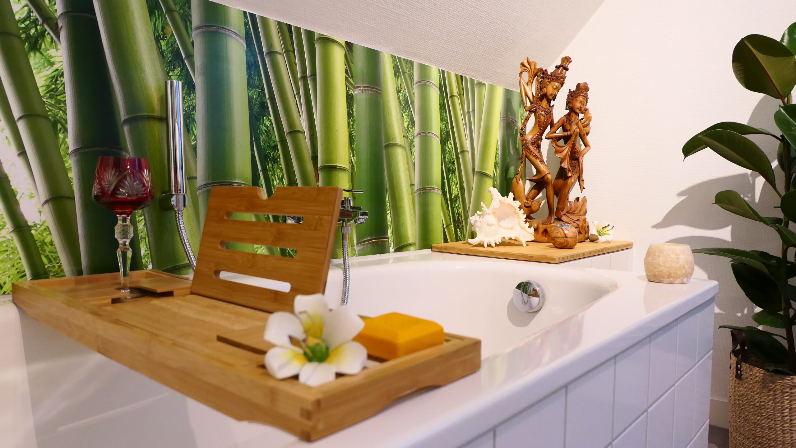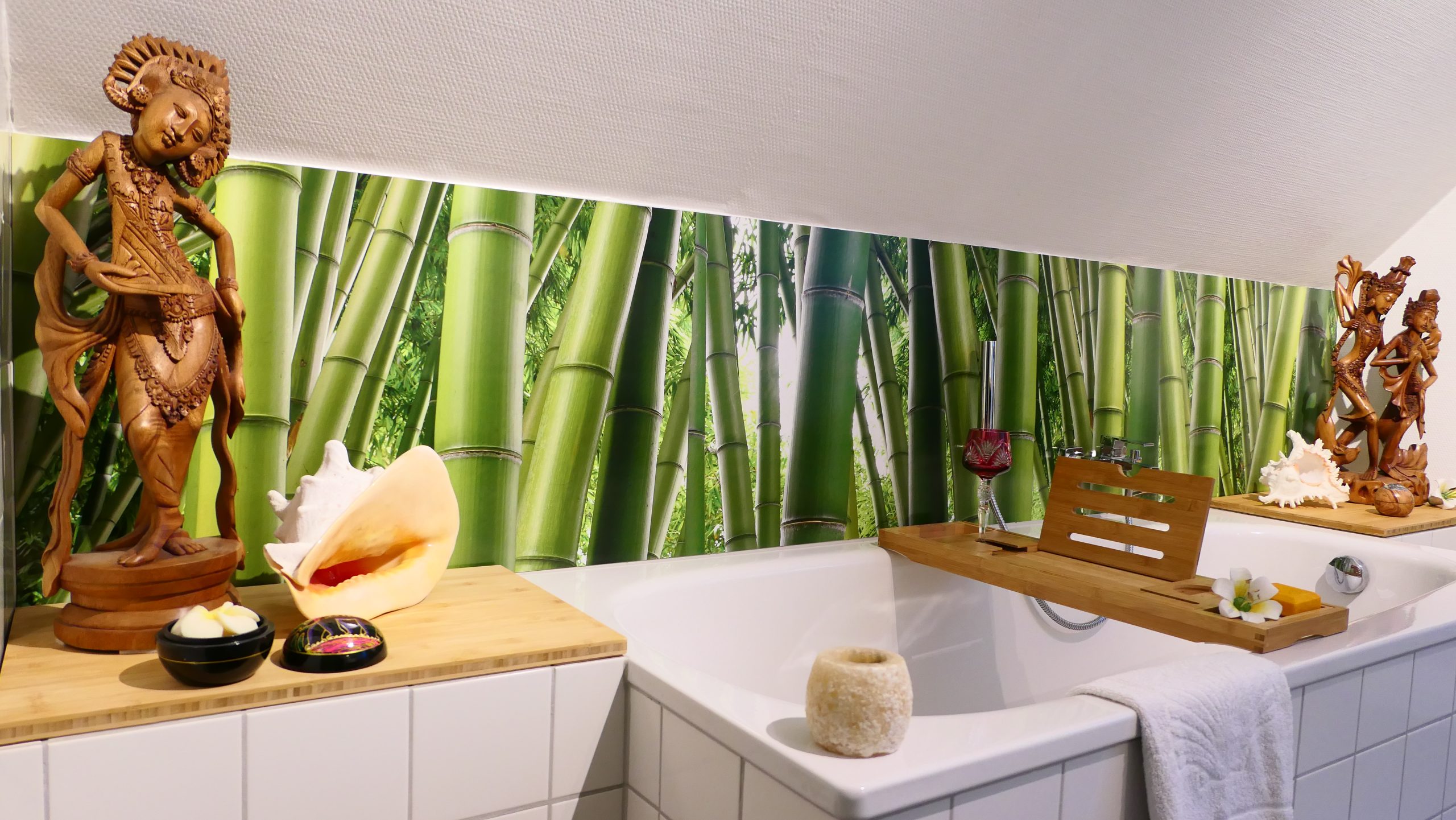Unsere Küchenrückwand Bambuswald wurde hier als Badewannenspritzschutz gekonnt in Szene gesetzt und mit Kleinmöbeln und stilvollen Deko Elementen ergänzt. Ganz klar: Daumen hoch für die kreativen Macher!