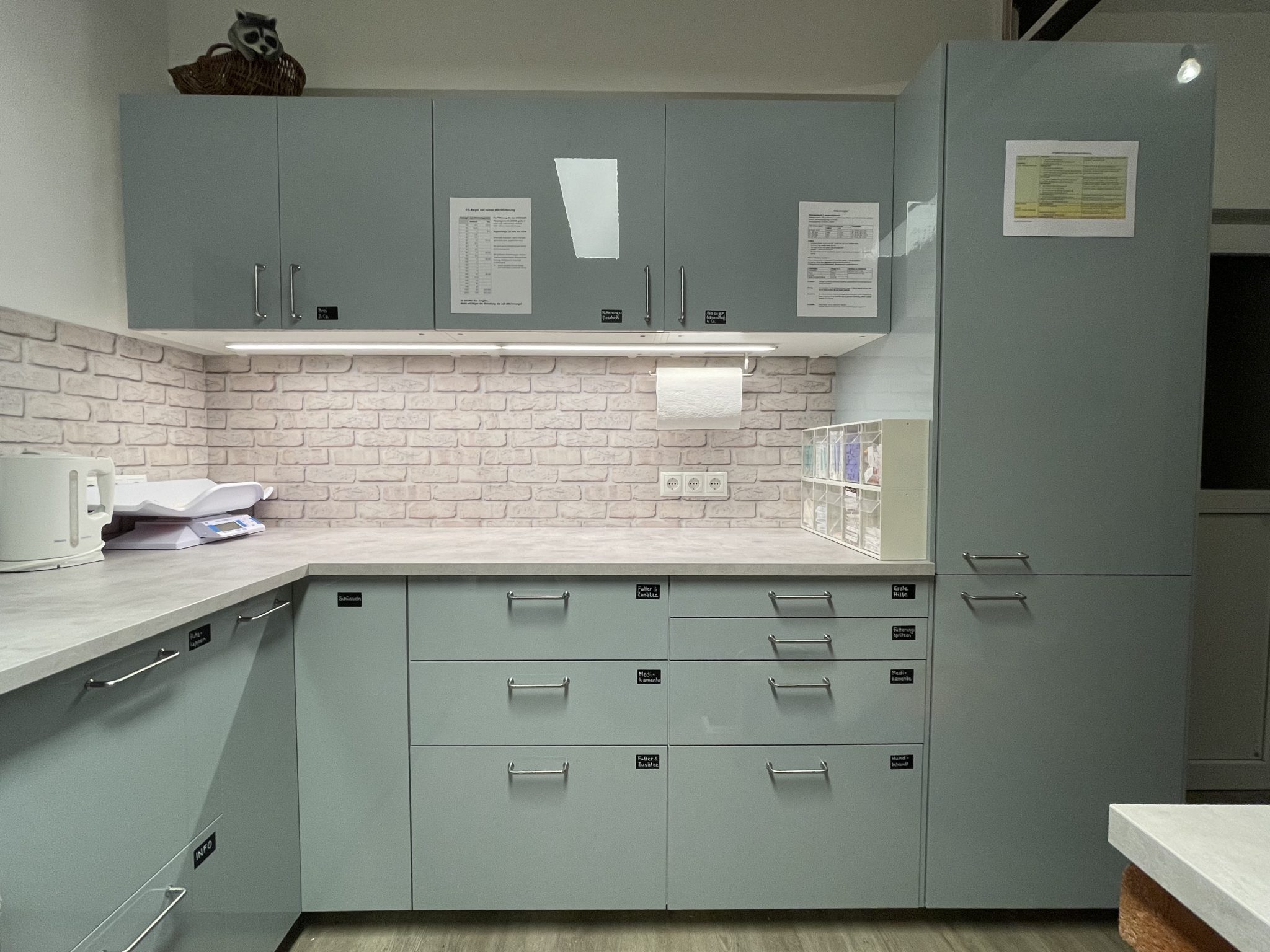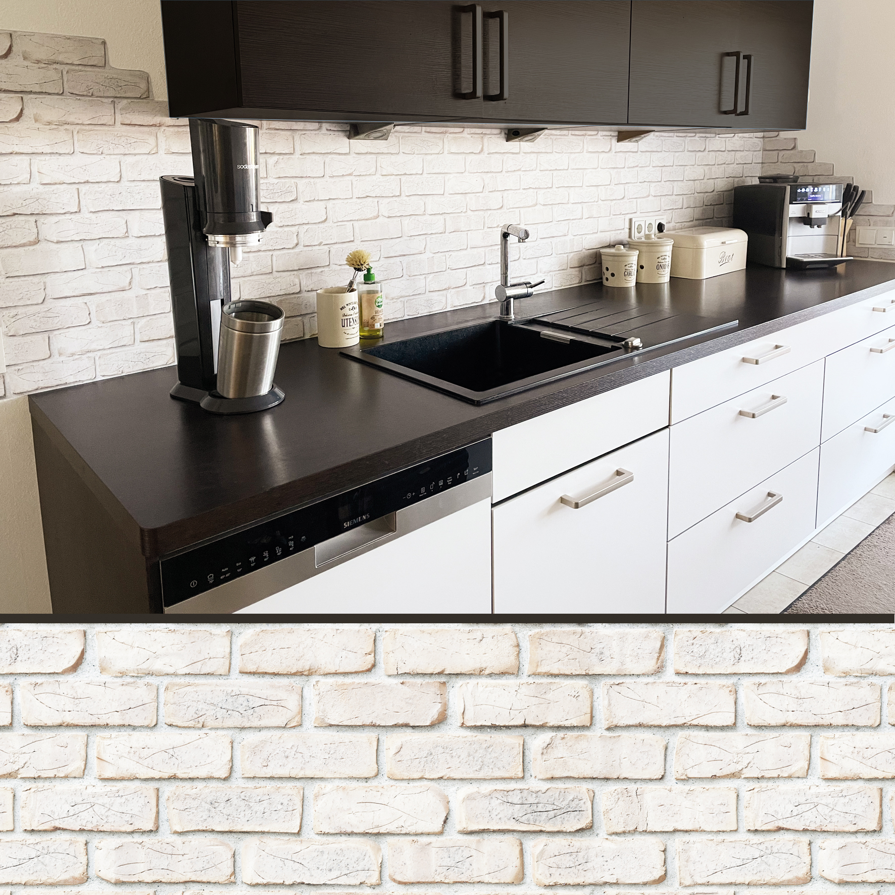 Die Küche lebt auf, gönnt man Ihr den positiven Effekt der Küchenrückwand GEKALKTE WAND. Ohne viel Stress und Baustaub angebracht. Besonders originell: Die Übergänge. Alles wirkt so harmonisch nur weil die Steine ausgeschnitten wurden. Daumen hoch für diese Idee!