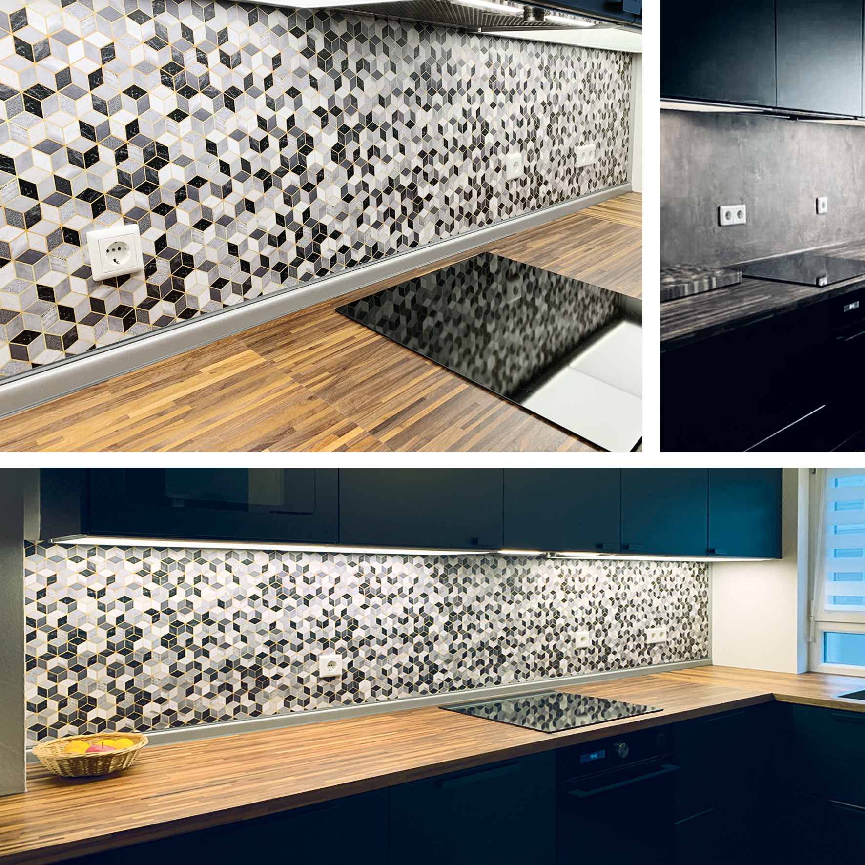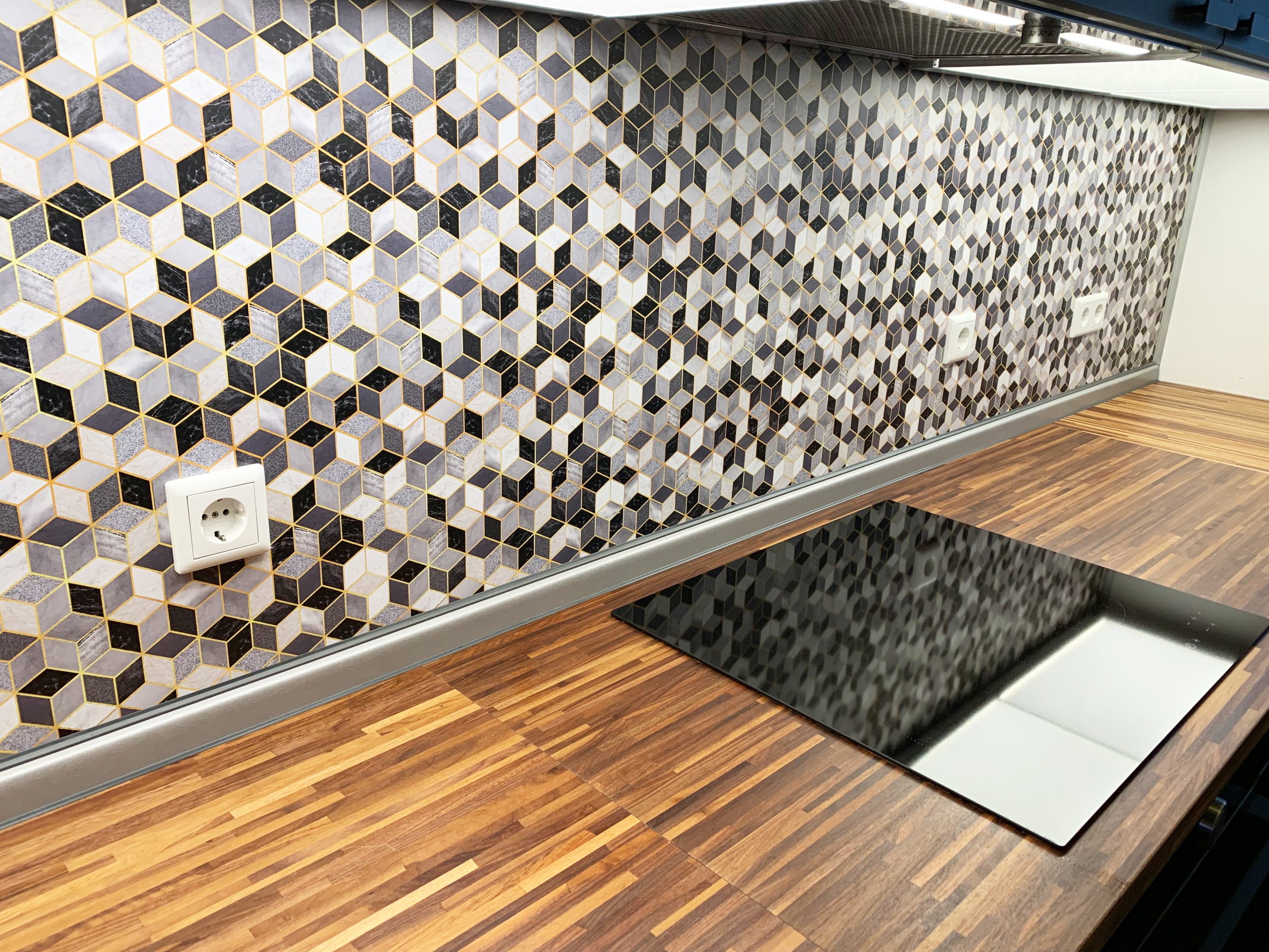 Wie kommt unsere Design-Cube Küchenrückwand an? Das geometisch abstakte und nahtlos gestaltete It-Piece passt in jede Küche. Die Rückwand ist zeitlos und zugleich modern. Die Farbgebung wirkt anregend aber nicht aufdringlich und sie setzt ganz nebenbei tolle Akzente.