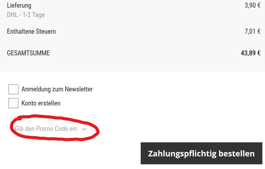 1. Klicke im Warenkorb oder an der Kasse auf "Gib den Promo Code ein" (ganz unten, oberhalb von "Zahlungspflichtig bestellen" !)
