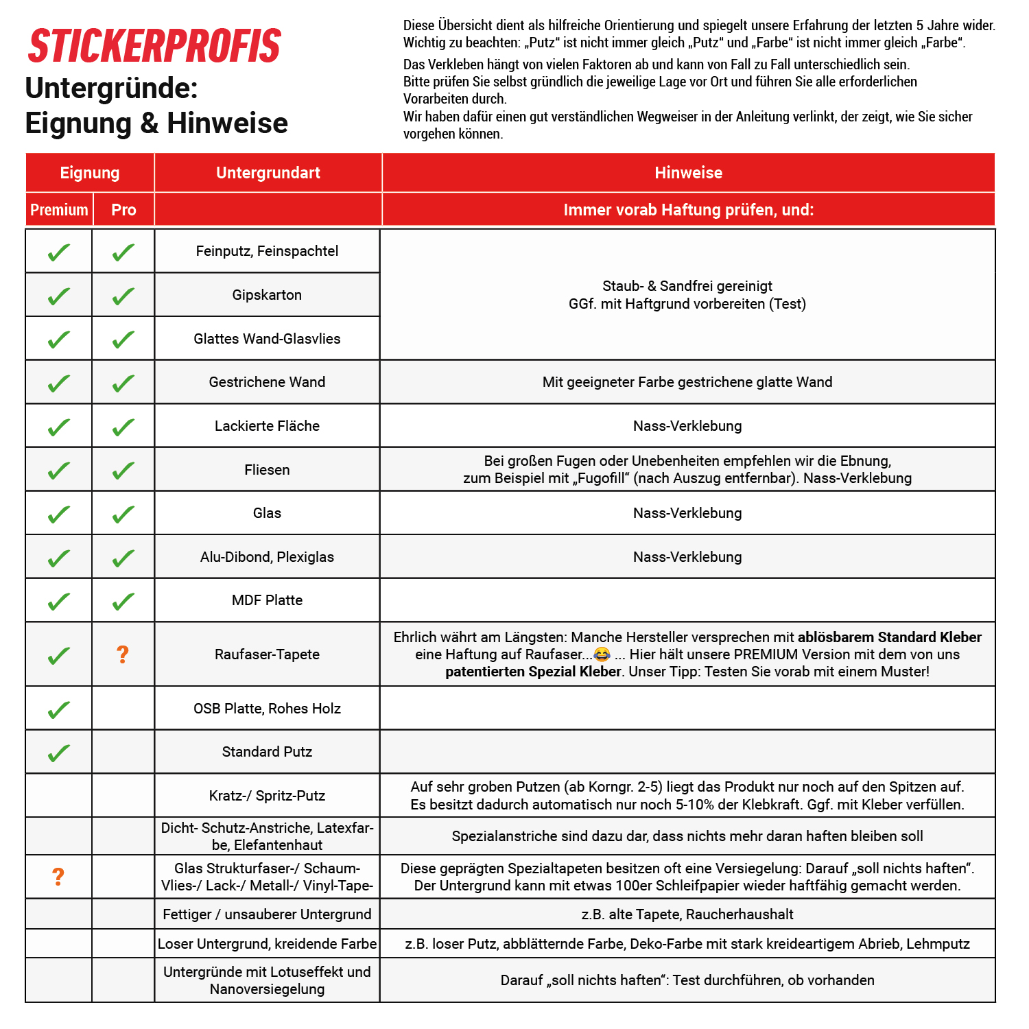 - Nur bei Stickerprofis: 99,9% aller Untergründe sind möglich (Siehe Untergrundtabelle! Auch die vielfach angefragte "gestrichene Wand" )